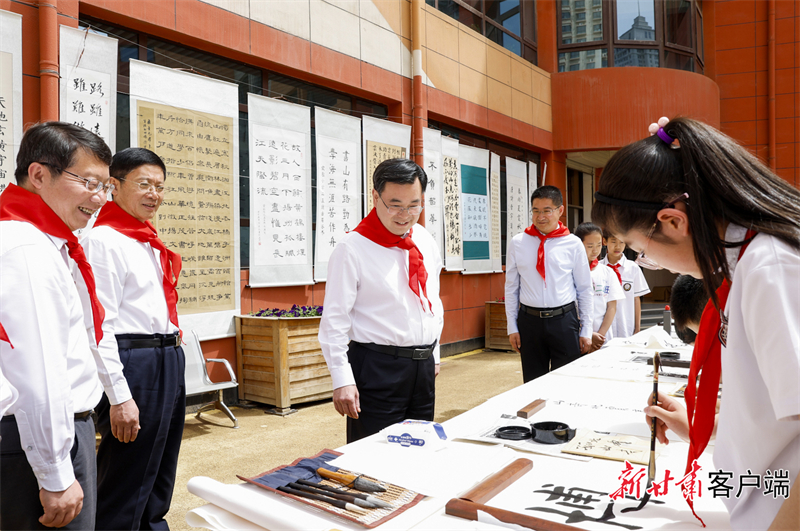 校園里處處洋溢著節日的氛圍,音樂演奏、拼貼畫制作、書法練習、科技小發明等社團活動豐富多彩,花樣跳繩、傳統武術、空竹、合唱等節目精彩紛呈。胡昌升走進校園,佩戴上鮮艷的紅領巾,不時駐足與孩子們互動交流,為孩子們的精彩創作和表演點贊。他說,少年兒童是家庭的寄托、社會的未來,是祖國的花朵、民族的希望,就像晨曦中初升的太陽,充滿朝氣、充滿力量、充滿希望。